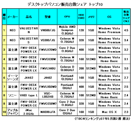 NECは2月からシェアが下降傾向にあるが、4月発売の「VALUESTAR N」が好調なことから5月以降はシェアを盛り返す可能性もある。富士通も4月に新コンセプトのリビングPC「FMV-TEO(テオ)」や映像の高画質化ボートを搭載した「LX」などを発売しており、「店頭ではNECと富士通が一騎打ち状態」(同)。これから本格化する夏のボーナス商戦は激しさを増しそうだ。(WebBCNランキング編集部・米山淳)
