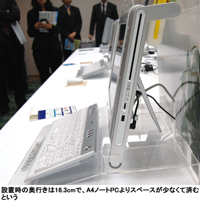 「VN500/JG」は15.4型ワイド液晶ディスプレイを搭載し、サイズは幅440×高さ298.6×奥行き210.4mm。設置時の奥行きは16.3cmでA4サイズのノートパソコンより占有スペースが小さいのが特徴。キーボードやマウスはワイヤレス方式で使用しない場合は本体の下に収納できる。