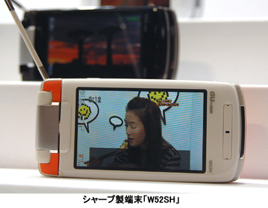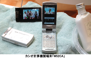 浴室で視聴が可能なIPX5、IPX7相当の防水仕様のカシオ計算機製端末「W52CA」、三洋電機製端末「W53SA」をはじめ、15機種のうち、7機種がワンセグに対応。「W52CA」は、2軸ヒンジ構造を採用しており、水を使う場所でもワイドビュースタイルで「ワンセグ」を楽しめる。ディスプレイには、2.6インチのワイドQVGA液晶を採用。画面輝度を補正したり、屋外での画質を向上させる光センサー補正などを備える画像処理回路も搭載した。
