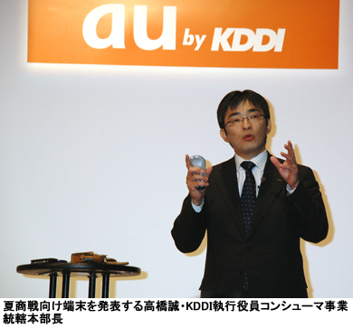 KDDIは5月22日、携帯電話ブランド「au」の夏商戦向けモデル15機種を6月上旬から順次発売すると発表した。「ユーザーひとり一人のライフスタイルに合うケータイ」(高橋誠・執行役員コンシューマ事業統轄本部長)をコンセプトに、防水仕様のワンセグ対応端末やメーカーのブランドとコラボレーションした端末など、多様なモデルを揃えた。