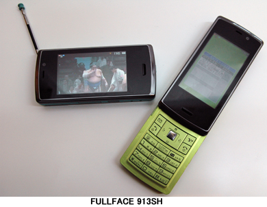 ワンセグ端末は4機種で、目玉となるのはスライド式のシャープ製端末「FULLFACE(フルフェイス) 913SH」。液晶画面をスライドするとダイヤルボタンや開始・終了ボタンなどすべての操作キーが隠れる「フルフェイス」と呼ぶデザインを採用。センサーキーを搭載しており、スライドを閉じた状態でも指で触れるだけで、チャンネルの切り替えやメニュー操作が行える。