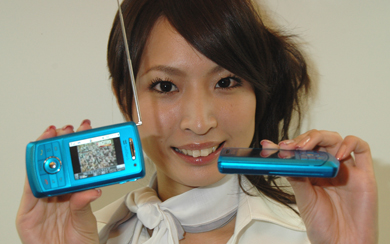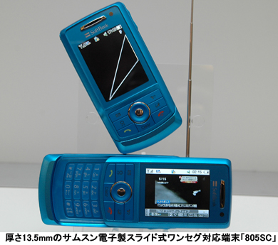 また、これまで力を入れてきた薄型端末を、ワンセグ対応モデルでも展開する。注目は、厚さが13.5mmでスライド式では世界最薄となるサムスン電子製端末「805SC」。幅は51×高さ100.6mmで、手のひらに収まるコンパクトサイズが特徴。「3Gハイスピード」にも対応する。