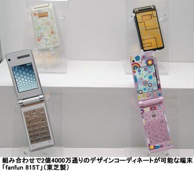 一方、デザインで「スタイル」を追求した端末も発売する。東芝製端末「fanfun(ファンファン) 815T」は、本体カラー15色、上下のパネル合計320色、画面デザイン100種類、イルミネーション30種類から選択することで、世界初の2億4000万通りのデザインをコーディネートできる。