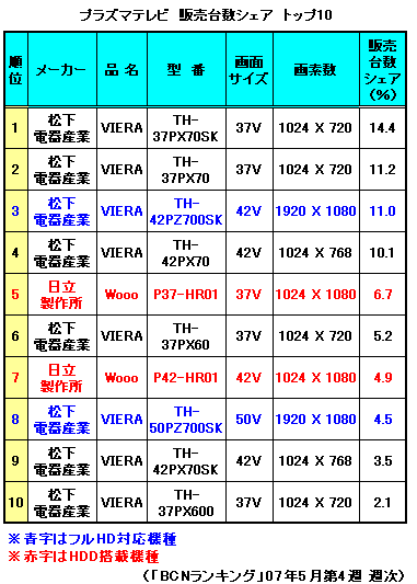 プラズマテレビで37V型の最上位機種が好調だ。「BCNランキング」5月第4週(5月21-27日)の販売台数シェアでは、07年4月発売の松下電器産業「TH-37PX70SK」が14.4%で、5月第2週(5月7-13日)から3週続けて1位を獲得している。