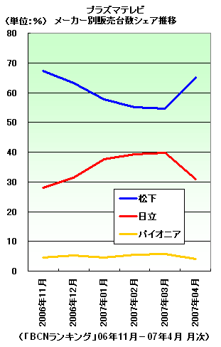 06年11月-07年4月のメーカー別販売台数シェア推移を見ると、松下、日立、パイオニアの3社がプラズマテレビ市場のおよそ9割を占めている。中でも松下は全体の約6割。しかし、06年11月から07年1月にかけて松下と日立の間が徐々に狭まり、07年3月は日立が39.7%まで上昇し54.6%の松下に接近した。だが、その後、2社のシェアは再び開きはじめ、4月には松下65.2%、日立30.8%という状況で推移している。(WebBCNランキング編集部・井上真希子)