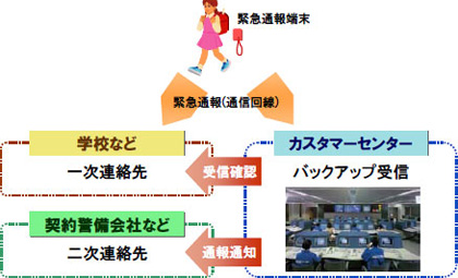 各児童が緊急通報端末を所持し、通学路上で不審者に遭遇したといった緊急事態発生時に、端末のストラップを引くことで、学校など事前に設定した一次連絡先に緊急通報を発信できるもの。通報の受信者は、インターネット上の専用ページにアクセスすることで、通報場所を確認できる。