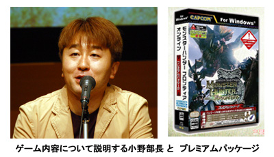都内で開催された発表会では、常務執行役員の稲船敬二氏が、「PCオンライン事業に参入するのであれば、一番自信のあるタイトルを、と思っていた。『モンスターハンター』は中身、サービスとも自信を持ってユーザーにお届けできる」と初のPCオンライン事業参入に対する意気込みを語った。
