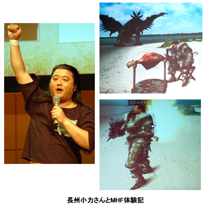 また記者発表の会場には、プロモーションの最終兵器として、お笑いタレントの長州小力さんが登場。MHFの魅力をアピールするプレゼンテーションを披露した。「『肉焼き』やってみました!」と題したプレゼンテーションは、巨大なモンスターがうろつく砂浜で悠長に肉を焼いている「こりき」が、モンスターに発見され、丸焼きにされてしまうという内容。このほか、友だちを作ろうと女性ハンターをナンパするなど、ちょっと違った楽しみ方を披露した。今後は、小力さんが出演するハンター同士の出会いを表現したムービーを公式サイトで配信する予定だという。