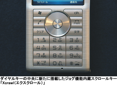 基本性能では、CPUに米マーベル社の「Marvell PXA270-520MHz」を採用し、処理能力を向上。OSにマイクロソフトの携帯・PDA用の最新OS「Windows Mobile 6」を採用し、ウェブ閲覧やメール機能の利便性を高めた。また、「Windows Mobile 6」のセキュリティやプライバシー機能の採用や名刺リーダーを搭載することで、法人ユーザー向けの機能も充実させている。新端末で最も重視したのが「操作性」。タッチパネルやPCと同配列のキーボードやダイヤルキーを搭載。また新たにジョグ機能内蔵スクロールキー「Xcrawl(エクスクロール)」を採用した。スクロールキーを使えば、なぞるだけでウェブの画面などがスクロールできる。4つの方式を備えることで、片手での操作から両手による長文入力まで快適な入力方法を選ぶこともできる。