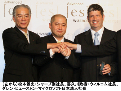 発表会にはシャープの松本雅史副社長とマイクロソフト日本法人のダレン・ヒューストン社長も出席。松本副社長は「ウィルコム、マイクロソフトと組むことで国内のスマートフォン(PDA型の携帯・PHS端末)市場を拡大したい」と話した。