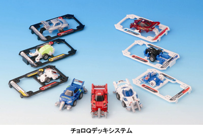 「チョロQデッキシステム」は、チョロQをボディ部分、ゼンマイを搭載したリア部分(後部)、フロント部分の3パーツに分割し、パーツを立体カード化したもの。カードを3枚重ね合わせて取り外すだけで、800通り以上のチョロQが組み立てられ、カスタマイズとバトルを楽しむことができる。