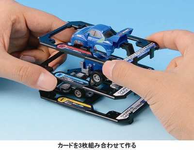 シリーズ第1弾では、「ボディカード」9種類(スターター6種+ブースター3種)、「リヤカード」10種類(スターター6種+ブースター3種+セット限定カード1種)、「フロントカード」9種類(スターター9種+ブースター3種)をラインアップ。パーツの性能が異なるさまざまなカードを組み合わせることで、マシンのスピードや強さが変化する。