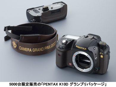 グランプリ受賞を記念した特別カラーやロゴなどをあしらった「PENTAX K10D GP」とバッテリーグリップ「D-BG2 GP」、グランプリ記念ストラップ「O-ST55」のセット。「K10D」本体はラバーのカラーを記念モデル限定のダークブランに配色。また、前面の「PENTAX」のロゴ、左手側前面の「K10D」のロゴ、上面のモードダイヤルの文字色を金色にしたほか、「CAMERA GRAND PRIX 2007」の文字とロゴマークを背面の液晶モニター下部にあしらった。カメラ本体には、グランプリパッケージ限定のシリアルナンバーも刻む。