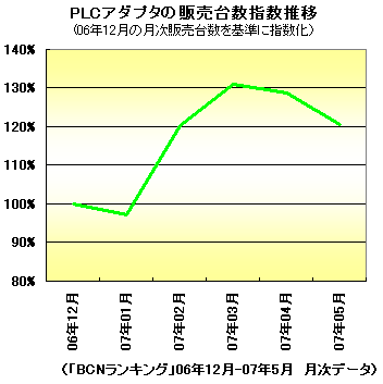 電力線をLANケーブル代わりにして、コンセントに接続すればネットワークが使えるPLC(高速電力線通信)アダプターの人気が高まっている。参入メーカーも増え、現在ではPLC製品で販売店の棚1つ丸ごと占領するほど存在感も大きくなってきた。販売も順調で、06年12月に比べると台数で30%程度の伸びを示している。初の家庭向けPLCアダプター発売から半年、BCNランキングデータで売れ筋を探ってみた。