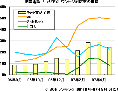 ソフトバンクは、06年12月の32.8%をピークにやや低下。月によって10-20%台で上下する状態が続いている。それまで1位だったワンセグ対応率トップの座も1月以降、auに明け渡した。ワンセグ人気の火付け役となった「AQUOSケータイ」の名を冠した端末が他のキャリアからも発売され、独占販売ではなくなったことが響いたようだ。夏モデルでは、パソコン並みの解像度を持つ3インチワイドVGA液晶とオートフォーカス機能付きの320万画素カメラを搭載した「AQUOSケータイ」第3弾「912SH」を含む4機種を投入。6月以降は、再度上昇に転じそうだ。