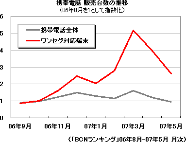 3キャリアを合算した携帯電話全体の「ワンセグ対応率」も、06年8月の8.8%からほぼ右肩上がりで伸び、07年3月・4月には28.5、28.6%と3割目前まで迫った。5月はやや下がって23.6%。この間の販売台数の推移を06年8月を1として指数化すると、12月と3月の2回の大きな山があり、それぞれ8月の1.49、1.6倍となった。さらに、ワンセグ対応端末に限れば、12月は2.47倍、3月は5.17倍と携帯電話全体の伸び率を大きく上回った。要因は、端末数の増加だけではないだろう。キャリアによって温度差はあるものの、携帯電話の一機能としてワンセグは急速に広まりつつある。