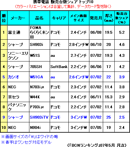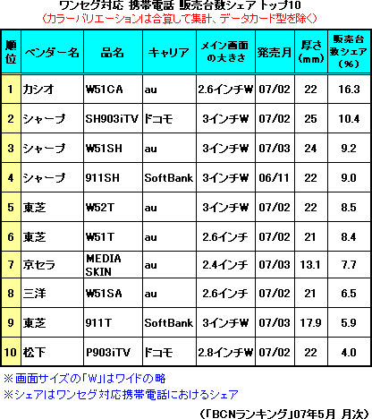 ワンセグ対応端末に限ったランキングトップ10では、2位から4位まで、ドコモ、au、ソフトバンクの順で同じシャープ製の「AQUOSケータイ」が占めた。シェアは2位の「SH903iTV」が10.4%、3位の「W51SH」が9.2%、4位の「911SH」が9.0%で、合算すると、1位の「W51CA」の16.3%を上回る28.6%。5月は、ワンセグ対応携帯電話の約3台に1台が「AQUOSケータイ」だったという計算になる。