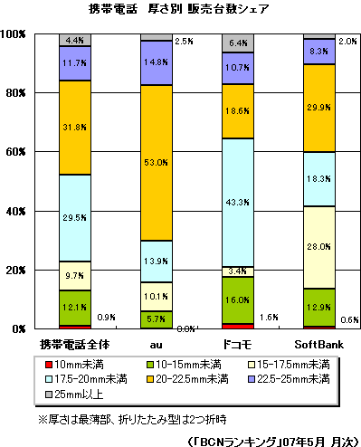もう一つのキーワード「薄型」はどうだろう? 本体の厚さが「15mm未満」の端末を「薄型ケータイ」と定義し、07年5月の「BCNランキング」から薄型ケータイ率をキャリア別に算出すると、ドコモ(17.6%)、ソフトバンク(13.5%)、au(5.7%)の順になった。携帯電話全体では13%。意外に薄型ケータイの割合は高くない。また、厚さ別の販売台数構成比では、ドコモは17.5-20mm未満、auは20-22.5mm未満が多く、ソフトバンクは15-17.5mmと20-22.5mm未満がほぼ同程度と、キャリアによる違いが大きく出た。