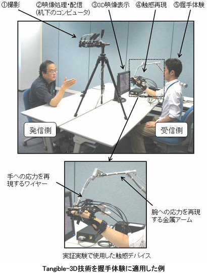 同社が05年に開発した、カメラを2台使って撮影した実写映像をリアルタイムに3D映像に合成するシステムを拡張した技術で、撮影した映像を3D合成して画像処理し、ソフトウェアで被写体の触感情報をリアルタイムに配信する処理を実現した。この技術により、たとえば遠隔地にいる人にリアルタイムで3D映像と触覚情報を送信し、擬似的な握手の感覚を伝達することが可能となる。