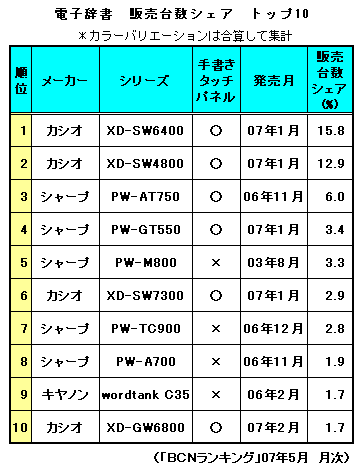 カラーバリエーションを合算して集計したシリーズ別販売台数シェアランキングを見てみよう。07年5月では、上位10シリーズ中6シリーズが手書きタッチパネル搭載モデルで「書ける辞書」の人気の高さがわかる。