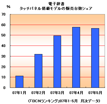 電子辞書市場全体を見ても、タッチパネル搭載モデルの割合はどんどん高まっている。販売台数シェアの推移を見ると、07年1月では11.1%と、市場の1割程度しかなかったが、07年4月には57.6%までに急成長。07年5月には56.5%と少し落ち着いたが、それでも全体の過半数を占めていることに変わりはない。