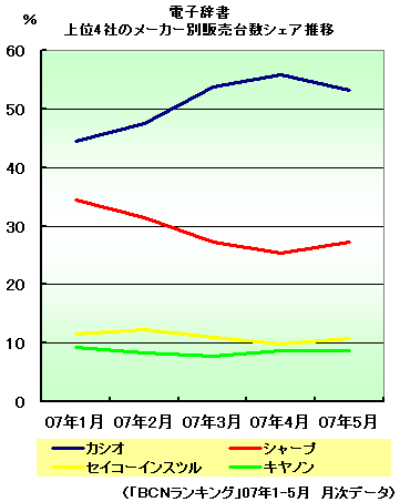 メーカー別販売台数シェアでは、手書きタッチパネル搭載モデルを豊富にラインアップしたカシオが、07年1月に44.5%だったシェアを、07年5月には53.2%までに拡大。そのため、業界ナンバーツーのシャープの同月シェアは27.3%で、カシオに倍近い差をつけられている状態だ。