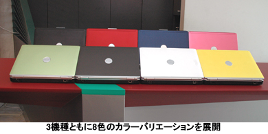 ノートPCは3機種とも、きょう体の素材にマグネシウム合金を採用。天板カラーは「クラシック・レッド」「オリーブ・グリーン」「カフェ・ブラウン」「インテリジェント・ブルー」「チェリー・ピンク」「シトラス・イエロー」「ピュア・ホワイト」「クール・ブラック」の8色を用意した。