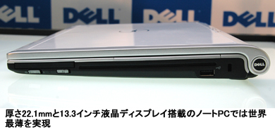 「XPS」ブランドでは、厚さ22mmで、13.3インチ液晶ディスプレイ搭載のノートPCでは世界最薄の「XPS M1330」を投入。同じく同日から販売を開始した。価格は12万6600円から。液晶ディスプレイのバックライトにLED(発光ダイオード)を採用することで、きょう体の厚さの削減と省電力を達成。IEEE802.11n(ドラフト版)に準拠した無線LAN機能やHDMI端子も搭載した。重さは4セルバッテリ搭載時で1.8kg。