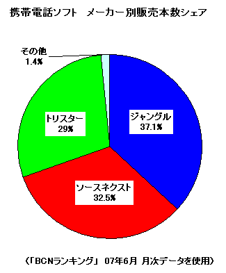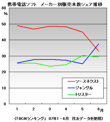 過去6か月の携帯電話ソフトの市場を見てみると、4月までは50%前後のシェアを握っていたソースネクストの独壇場。しかし、5月に入るとシェアが下がリ始め、5月で44.2%、6月で33.5%と、と大きく後退した。一方、これまで2位に甘んじていたジャングルは、5月が24.7%、6月で37.1%とシェアが急拡大しトップに躍り出た。