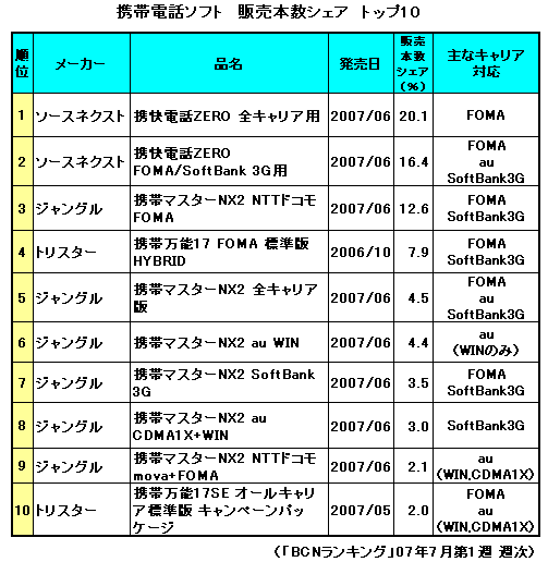 07年7月の第1週(7月2日‐7月8日)の販売本数シェアでは、シェア20.1%でソースネクストが6月29日に発売した「携快電話ZERO 全キャリア用」が1位を獲得。2位もシェア16.4%で同社の「携快電話ZERO FOMA/SoftBank 3G用」で、発売からわずか10日で、1位・2位を「ZEROシリーズ」が独占した。3位にはシェア12.6%でジャングル「携帯マスターNX2 NTTドコモ FOMA」(6月14日発売)が入った。