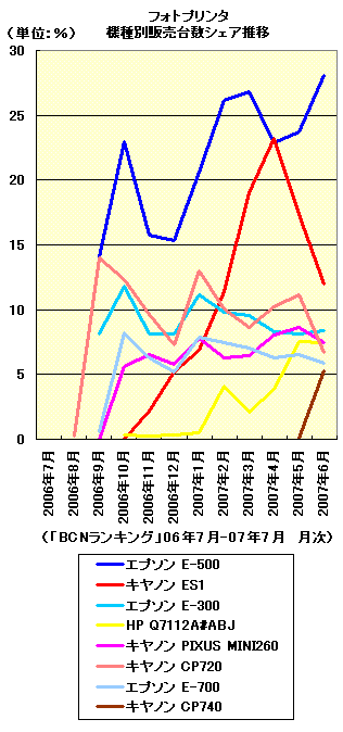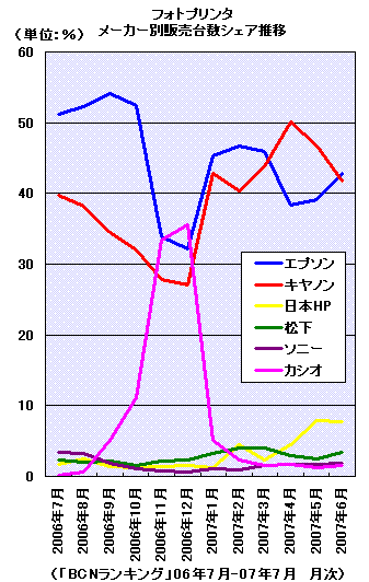 メーカー別の販売台数シェアを見ると、エプソンとキヤノンの2社が市場の8割を占めながら激しいつばぜり合いを演じている。この1年間の推移を見ると、06年7月-10月はエプソンが50%台前半、キヤノンが30%台の2強が続いたが、06年11月にはカシオが30%台まで急成長し、12月にはついに1位を奪われた。しかし、その後07年1月からは再びエプソンとキヤノンが40%台でトップを争い、4月にはシェア50.1%でキヤノンが逆転。2か月間はキヤノンがこの状態をキープしたものの、6月には再びエプソンが1位を奪い返した状態だ。