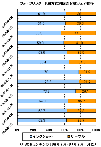 印刷方式別では、現在、インクジェットとサーマルがおよそ6対4。直近1年間の推移では06年10月-12月に約7対3になったが、売れ筋としてはインクジェットに人気が集まっているようだ。