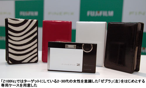 富士フイルムでは「Z100fd」のターゲットを2-30代前半の女性に設定。「ピンク」「ホワイト」「ブラック」「ゼブラ」の4色の専用ソフトケースを9月下旬に発売する。価格は4200円。