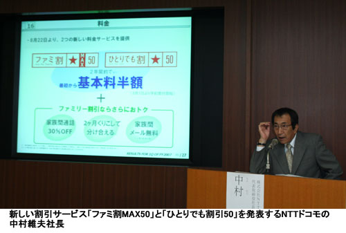ドコモでは当初、家族向けに基本使用料金が最大半額になる新しい割引サービス「ファミ割MAX」を9月1日、加入者単独でも利用年数に応じて基本使用料が最大半額になる割引サービス「ひとりでも割引」を8月22日から開始する予定だったが、KDDIが7月19日に2年間の継続契約を条件に誰でも月額基本料を50%割引する「誰でも割」を9月1日から始めると発表。「我々が出した料金プランでKDDIが反応し、やらざるをえなくなった」(中村社長)として対抗策を打ち出した。