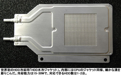 2社ではHDDとCPUを一緒に冷やすシステムも世界で初めて開発した。専用ケースに入れたHDDを、CPUと同様、細かな溝を掘ったジャケットに接触させて冷却。その後続けて、CPUのジャケットに水を流して冷却する。「CPUの熱量は65W、HDDは15Wで、HDDの方が熱が少ないため、HDDを冷やした後の水でも十分、CPUを冷却できるし、冷却性能も高まった」(源場英明・日立製作所ソリューションビジネス事業部センタ長)という。さらにHDDのケース内部には吸音材と防振材を取り付け静音化。新型ジャケットでCPUの冷却性能も向上し、ファンの回転数を1000rpm以下にしたことで、CPU、HDDがともにフル稼働の騒音を25dbに抑えた。日立がCPU冷却技術と全体の設計を担当。HDDの冷却とシステム設計は2社が協同で行った。生産は日立のマレーシア、クアラルンプール工場。