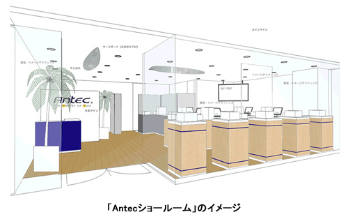 ショールームのフロア面積は73.20平方メートルで、AntecのPCケース「Twelve Hundred」「miniP180」、電源「TPQ-1000」、周辺機器「AV cooler」など未発表製品を含むすべての現行製品を展示する。
