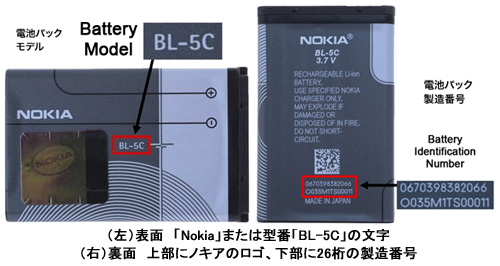 該当する充電池かどうかを知るためには、電池パック表面に「Nokia」や「BL-5C」の文字、裏面の上部にノキアのロゴが記載されいているかを確認。該当の充電池だった場合には下部に印刷されている26桁の製造番号をノキアのウェブサイトかコールセンター(0120-830-670)で確かめる。