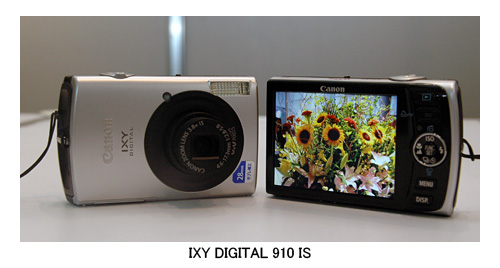 「IXY DIGITAL 910 IS」は、前機種「900 IS」の後継モデルで、35ミリ換算で28-105mmの光学3.8倍ワイドズームレンズを搭載。指を置くとセンサーが感知し液晶モニターに操作アイコンを表示する「タッチホイール」、押すだけで電源オフでもすぐに画像の再生ができる「再生ボタン」を新たに備えた。モニターは3.0型で約23万画素の「クリアライブ液晶」。サイズは幅92.6×高さ58.8×奥行き25.9mm、重さは約155g。実勢価格は4万7000円前後の見込み。