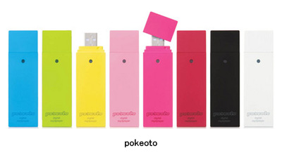 「pokeoto」は、幅27×高さ88×奥行き18mmのポケットサイズの携帯オーディオ。PCのUSBポートに本体のUSBコネクタを直接接続でき、USBメモリとしても使用可能。カラーは、イエロー、グリーン、ブルー、パステルピンク、ショッキングピンク、レッド、ブラック、ホワイトの全8色。