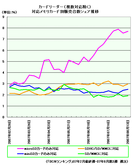 逆に単体のメモリカードに対応するタイプの販売台数シェアはおおむね2-3%で推移している一方で、microSDカードのみに対応するタイプが急伸。2月下旬に2.9%だったシェアが、8月中旬には7.7%と半年でおよそ2.5倍に増えた。