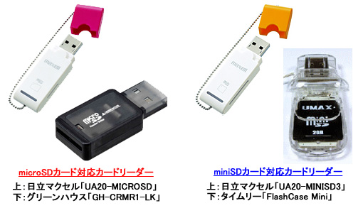 一方、miniSDカードに対応する機種は、3位の日立マクセル「UA20-MINISD3」が5.6%。USBコネクタにはオレンジのキャップを備え、カードスロットは側面に搭載する。10位のタイムリー「FlashCase Mini」はシェア2.5%で、本体にクリアケースを採用するのが特徴。二枚貝のようにふたを開けてカードを装着する。紛失を防止するストラップが付いている。