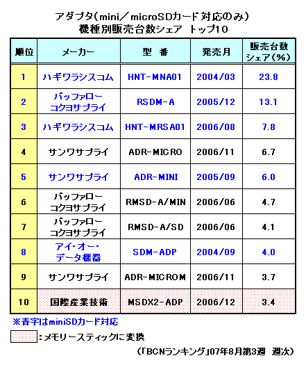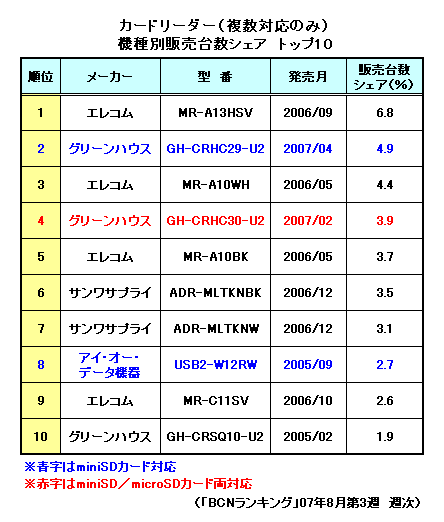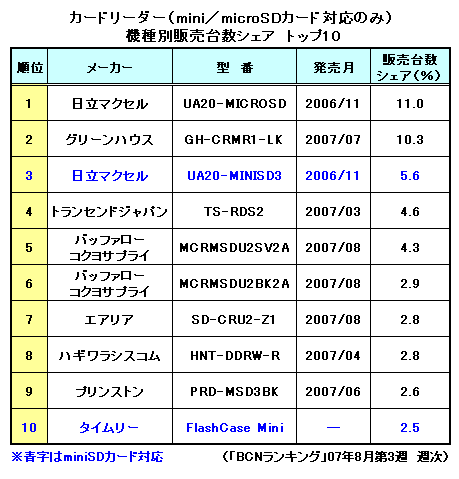 ここで、携帯電話で多く利用されているminiSDカードとmicroSDカードに対応するカードリーダーについて、機種別に売れ筋を見てみよう。8月第3週(8月13日-8月19日)の機種別販売台数シェアトップ10のうち、8機種がmicroSDカード、2機種がminiSDカードに対応する。また、発売月から分かるように、今年の夏に発売した新製品が多い。