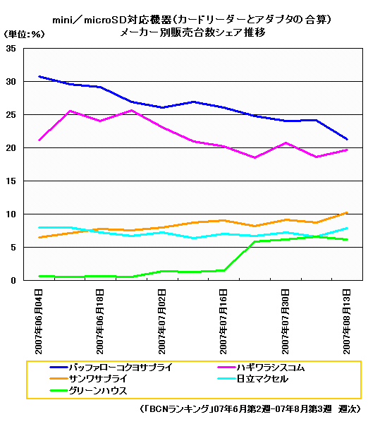 mini/microSDカードに対応するカードリーダーとアダプタをともに販売するメーカーの動きも見ておこう。直近の6月第2週から8月第3週(6月4日-8月19日)までのメーカー別販売台数シェア推移では、バッファローコクヨサプライが1位、2位はハギワラシスコムとなっているが、2社ともシェアは下降している。バッファローは6月上旬に30.8%だったが、8月上旬では21.3、ハギワラシスコムも同じ期間で21.2%が19.7%と右肩下がり。