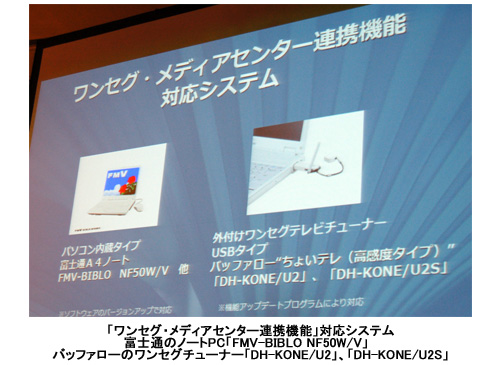 日本テレビ(久保伸太郎代表取締役)では、パソコンでワンセグ放送を視聴しているユーザーを対象に「ワンセグ・メディアセンター連携機能」を提供する。マイクロソフト、バッファロー、富士通と共同で開発した機能で、日本テレビが「メディア オンライン」上で公開している動画コンテンツに簡単にアクセスできるのが特徴。