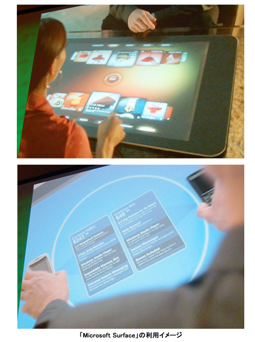 このほか、ヒューストン社長は「一般向けになるのはもうしばらく先」としながらも「Microsoft Surface」の紹介も行った。タッチスクリーン付きのテーブル型コンピュータで、マウスやキーボードを必要とせず、すべてタッチすることで操作できるのが特徴。複数のユーザーが同時に使うこともできる。