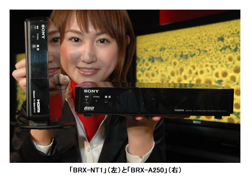 加えて、デジタルチューナー内蔵のHDDレコーダー「BRX-A250」とインターネット経由のビデオ・オン・デマンド(VOD)が可能なネットワークTVボックス「BRX-NT1」も発表した。「BRX-A250」は250GBのHDDを搭載し、ハイビジョン画質で70時間の録画が可能。両製品とも本体の小型化に成功し、テレビの背面に取り付けることができる。「BRX‐A250」の外形寸法は、幅25.5×高さ5.2×奥行き14.8cm。「ブラビアリンク」にも対応し、HDMIケーブルで接続すれば「おき楽リモコン」で操作が可能。発売日はともに11月20日で。価格はオープンで、実勢価格は「BRX-A250」が5万円前後、「BRX-NT1」が3万円前後の見込み。