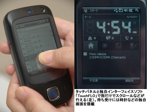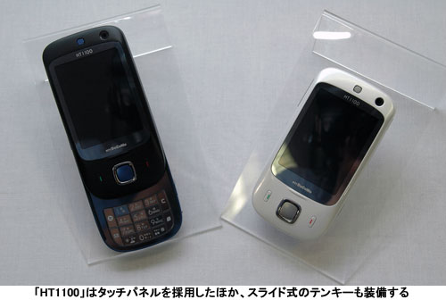 「HT1100」は、2.6インチのタッチパネルディスプレイとHTCの独自ユーザーインターフェイスソフト「TouchFLO」を搭載。電話帳や通話操作をはじめ、ブラウザやフォトアルバム、メールのスクロールが指だけで行える。スライド式テンキーも装備する。