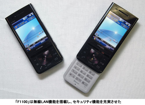 一方、「F1100」は、IEEE802.11a/b/gの無線LAN機能を搭載。対応予定のドコモの企業向けIPソリューション「PASSAGE DUPLE(パッセージ・デュプレ)」「ビジネスmoperaIPセントレックス」を利用すれば、企業用のIP内線電話としても使用できる。非接触IC「FeliCa(フェリカ)」も搭載しており、オフィスの入退室カードとしても利用できる。