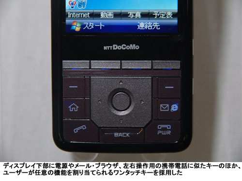 インターフェイスには、携帯電話と同じようなキー操作が可能なスライド式テンキーを採用し、待ち受けも携帯電話に似た独自画面を搭載した。ユーザーが任意の機能を割り当てられるワンタッチキーも備える。
