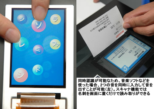 新型液晶は画像を認識して入力する光センサーを採用。センサーを液晶のRGBの画素1つ1つに組み込み、額縁部に駆動回路を設置した。そのため、従来のタッチパネル液晶では難しかった複数ポイントの同時認識が可能になり、たとえば画面に表示した地図の拡大縮小が2本の指で簡単に行える。また、画面の上に置くだけで、スキャナのように文書などを読み取ることもできる。スキャナ機能は2次元コードの読み取りや指紋認証にも対応させる予定。